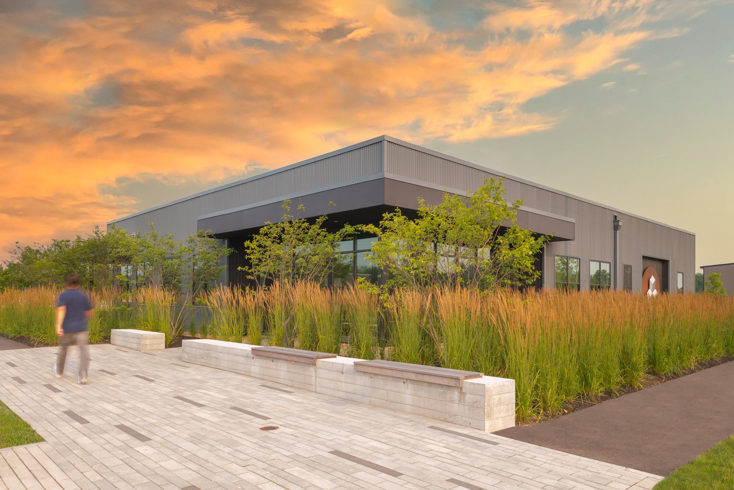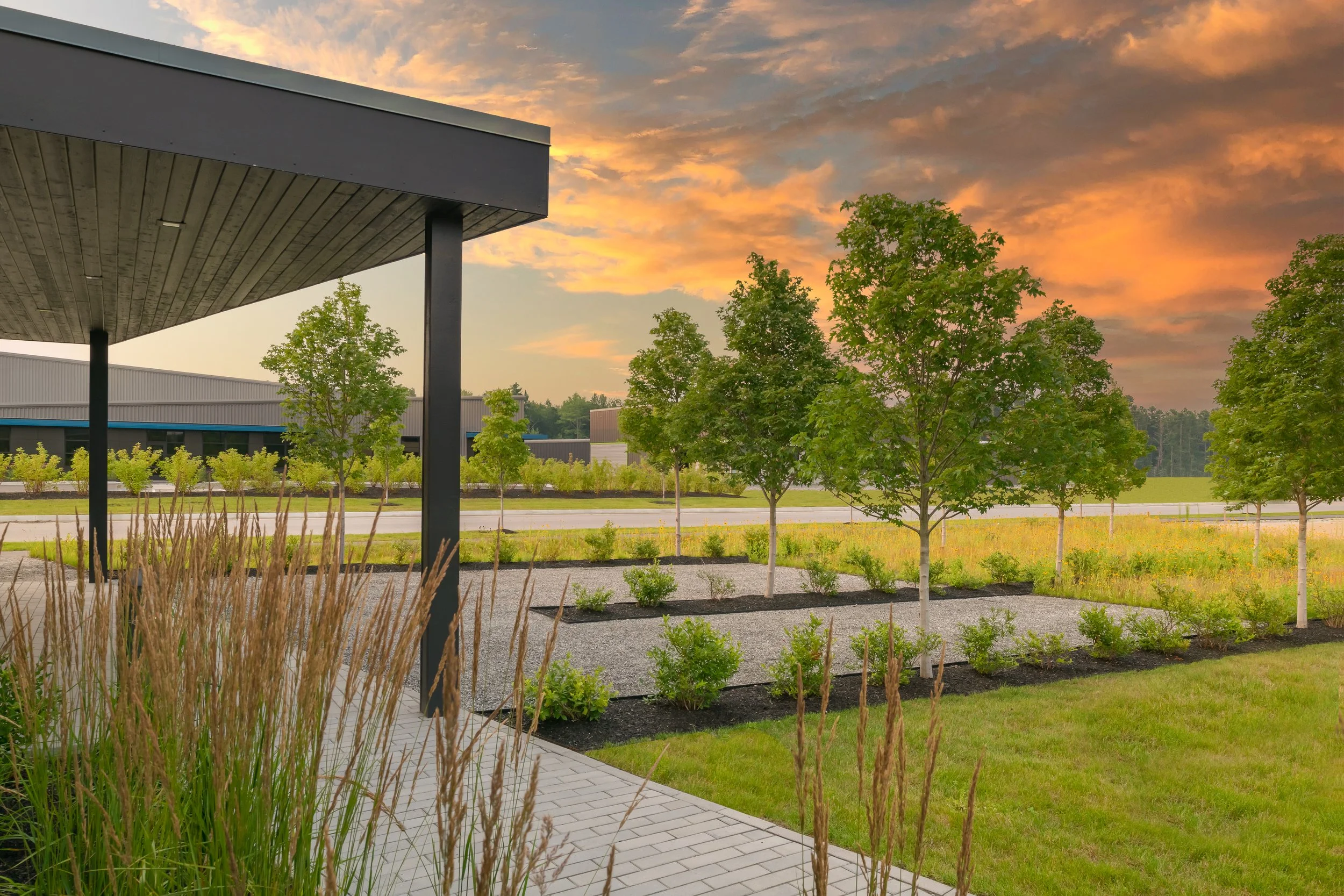 Scorebuilders is a small, 10,000sf commercial-office boutique developed as the first lot in the 150-Acre Innovation District at Scarborough Downs. ALA was the lead master planner and landscape architect charged with laying out the Innovation District. The design centered around a four-way intersection with streetscape enhancements and a pavilion design by ALA which doubles as both shelter for commercial mail boxes as well as a future bus stop. Scorebuilders approached ALA to help design and permit the small commercial building and site. As the first lot to be permitted in the large subdivision, ALA faced the challenge of proving to the local planning board that our placemaking and design guidelines we had developed through the master planning process would be employed successfully on the Scorebuilders lot and in coordination with the surrounding intersection. This project offered the unique opportunity for ALA to integrate public streetscape and placemaking design with the private commercial lot. Our work at Scorebuilders and the surrounding Innovation District at The Downs are also prime examples of how good design and placemaking can attract significant investment. Today, the surrounding district is comprised of more than 250,000 square feet of commercial, industrial and residential development, including the state’s first Costco, Idexx Laboratories, Crown Lift, Throttle Car Club and other businesses. The outcome is a decidedly elegant, modern, and tasteful site.